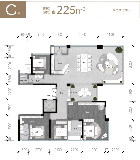 除以上共有亮点外,225户型还用上了时下流行的“全景舱”设计理念,可三面采光的客厅视野极好且十分通透。