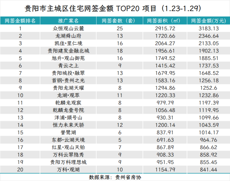 据贵州省房协统计数据,2026年1月23日至2026年1月29日,贵阳主城六区住宅网签金额榜单中: