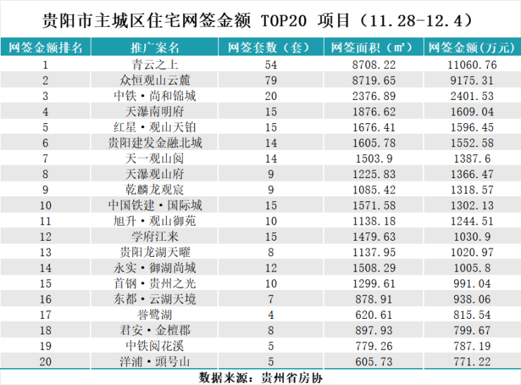 据贵州省房协统计数据,2025年11月28日至2025年12月4日,贵阳主城六区住宅网签金额榜单中: