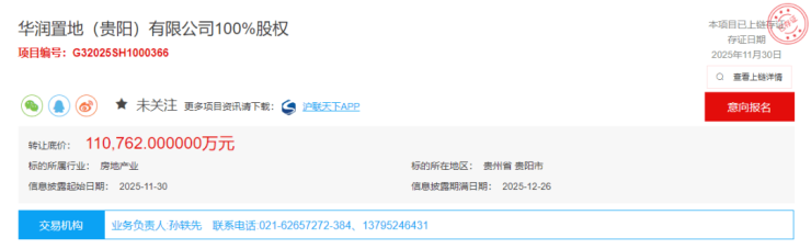 2025年11月30日,据上海联合产权交易所公开信息,海南华润石梅湾旅游开发有限公司公开挂牌转让华润置地(贵阳)有限公司100%股权,转让底价约11.08亿元。