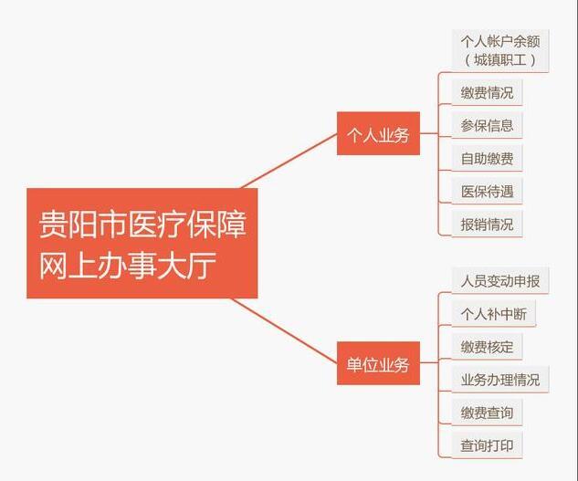 贵阳市医疗保障网上办事大厅是为参保人员及参保单位办理医疗服务相关事项而设立的网上服务平台,分为个人业务和单位业务两个模块,其中个人业务模块具有城镇职工个人帐户余额、缴费情况、参保信息、自助缴费、医保待遇、报销情况6项业务功能,单位业务模块具有人员变动申报、个人补中断、缴费核定、业务办理情况、缴费查询、查询打印6项业务功能。我局将不断完善在线办理医疗保障业务功能,进一步方便参保人员及参保单位办事,不断增强人民群众的获得感幸福感。