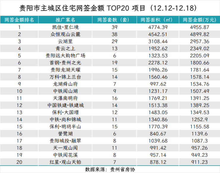 据贵州省房协统计数据,2025年12月12日至2025年12月18日,贵阳主城六区住宅网签金额榜单中: