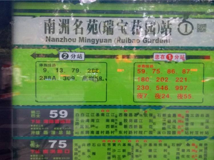 广州海珠汽车客运站(公交站):南K2路;海珠客运站(临时站)(公交站):301路;海珠客运站总站(公交站):5路;9路;13路;82路;287路;301路;551路;582路;582路班车;762路;788路;836路;987路;B7路;B7路快线;夜4路;夜7路;夜44路;南洲名苑北(公交站):5路;35路;70路;82路;129路;287路;夜4路;夜24路;夜102路;海珠客运站(公交站):5路;9路;13路;35路;59路;70路;79路;82路;86路;87路;125路;129路;180路;221路;230路;287路;288A路;288路;303路;309路;551路;836路;882路;960路;991路;997路环线;B7路快线;南K2路;夜4路;夜7路;夜30路;夜44路;夜55路;夜102路;广从11快线(周五-周日);广从11线;高峰快线40路;高峰快线58路;(停运)202路;南洲名苑(公交站):9路;13路;59路;75路;79路;86路;87路;180路;221路;230路;288A路;288路;303路;309路;546路;551路;882路;997路环线;夜7路;夜24路;夜30路;夜55路;高峰快线58路;(停运)202路;大干围北站(公交站):766路;997路环线;夜30路;大干围中(公交站):766路;997路环线;夜30路;江晓路(公交站):766路;晓港湾(盈丰路)(公交站):263路;546路;766路;780路;836路;960路;991路;
