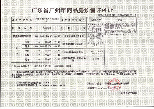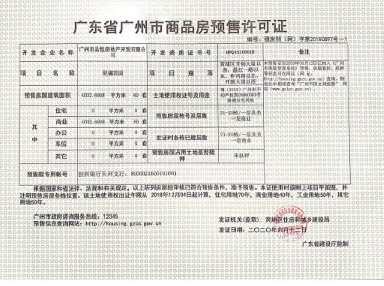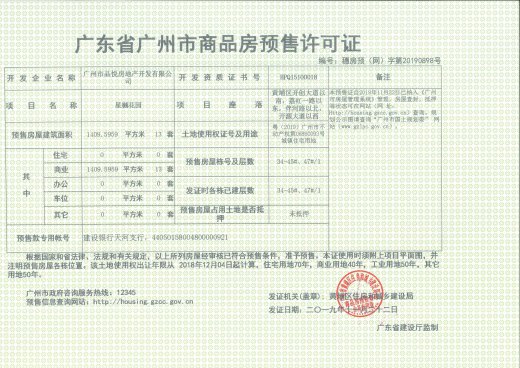 - 穗房预字第20190898号 详情发证时间 2019-11-22绑定楼栋34#、35#、36#、37#、38#、39#、40#、41#、42#、43#、44#、45#、47#证件照片