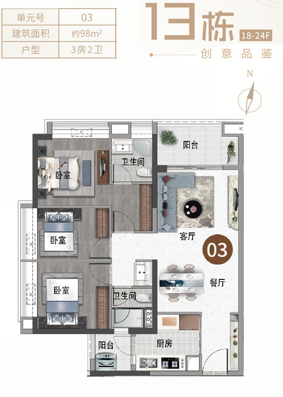3室2厅2卫-13栋建面约98平三房03户型