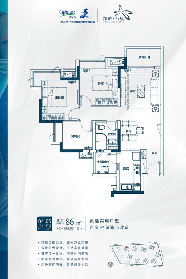 凯德万黛项目占地面积约5万m2,总建面积15万㎡,一次性开发,容积率≤3.0,绿化率≥30%。待售9栋洋房含括90㎡~135㎡,均为2梯6户。