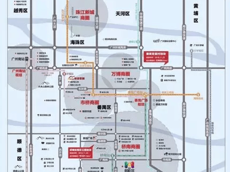 【地铁】约10分钟的车程接驳广州地铁三号线市桥站、番禺广场站;通过地铁约30分钟到达天河、越秀、海珠等主要中心城区;另外,广州地铁地铁18号线已经动工,将为片区交通出行提供更为快捷、便利的出行方式。
