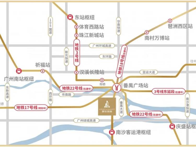 地铁交通:目前地铁3号线番禺广场站,转公交到达草河村站。 未来地铁线:3号东延线、17、18、22。