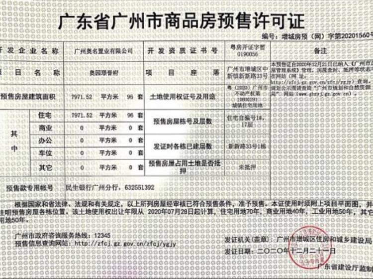 - 20210584 详情发证时间 2021-06-18绑定楼栋预售范围:奥园璟誉府住宅,公建(自编2#,D2#、D5#、D6#、D7#)。预售套数:96套,预售面积:8068.8㎡,预售业态为住宅
