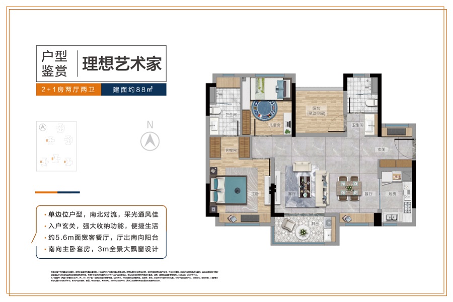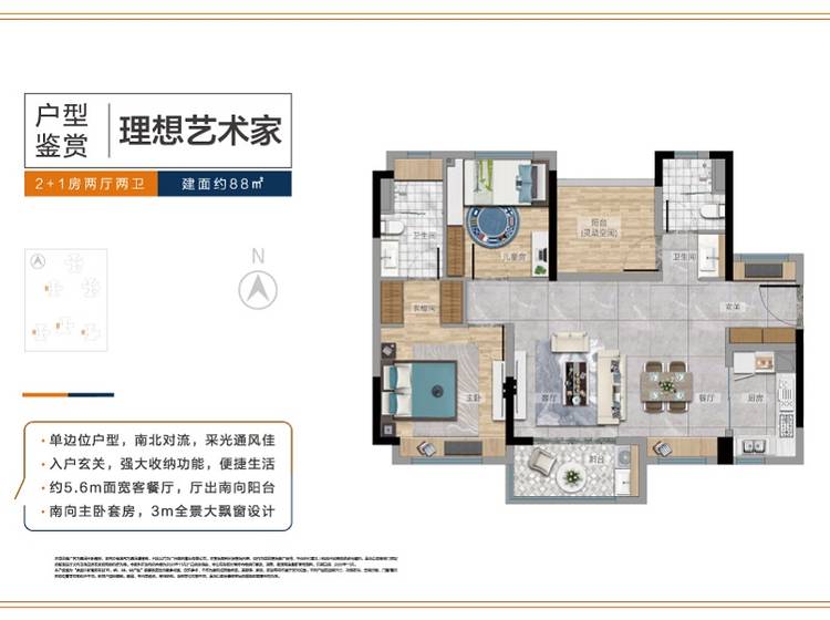 3室2厅2卫-88㎡“2+1”房