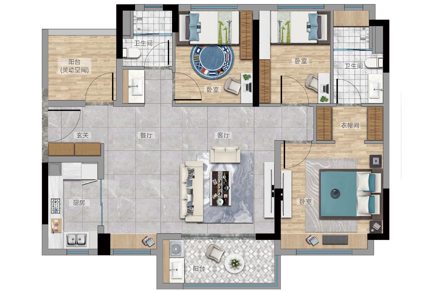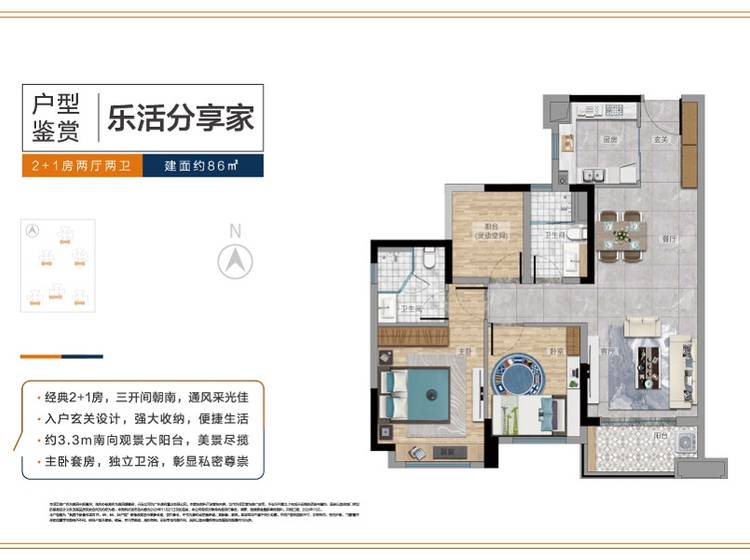3室2厅2卫-86㎡“2+1”房