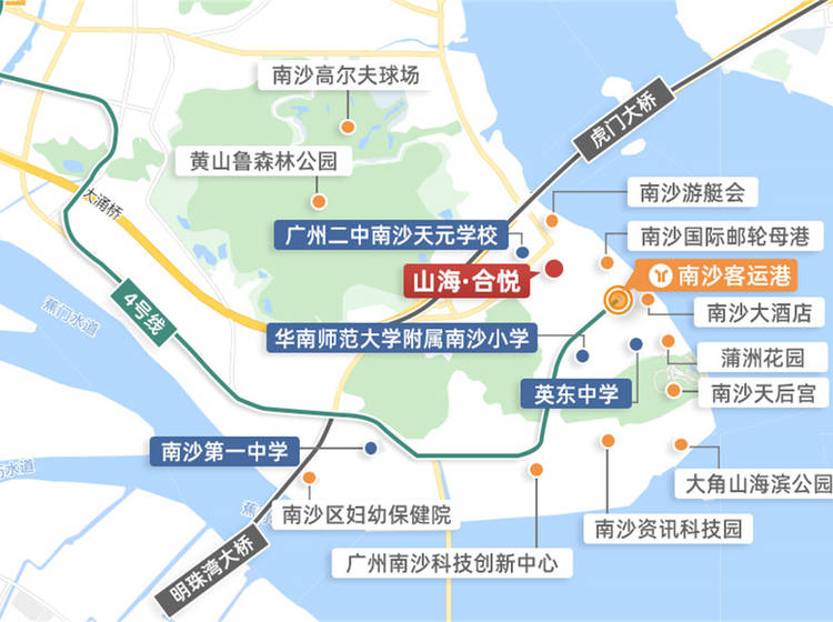 山海·合悦,位于世界湾区海上门户的南沙湾芯,广州市二中南侧,毗邻邮轮母港、南沙游艇会、南沙大酒店等高端配套。