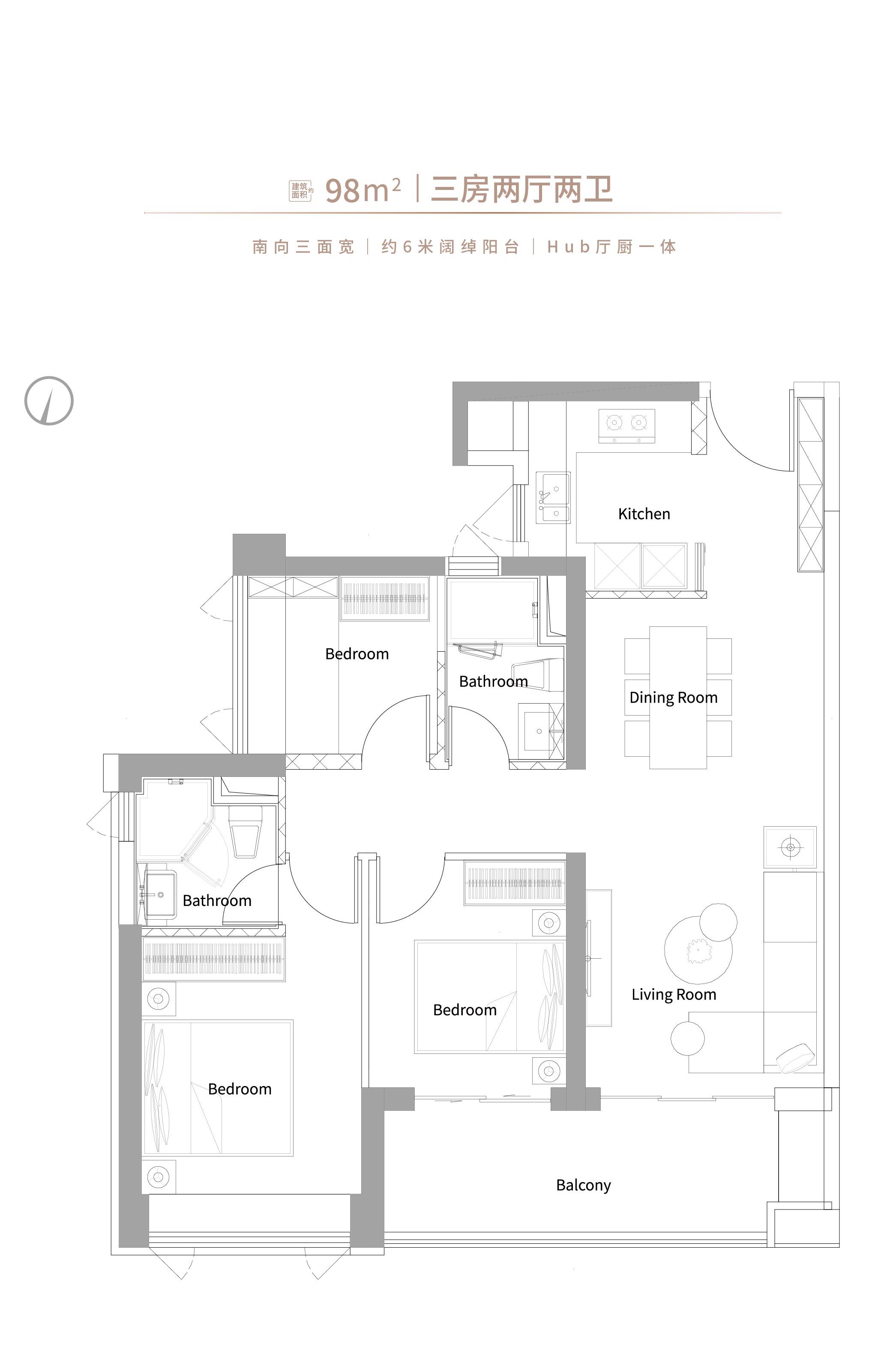 3室2厅2卫-建面约98平三房两厅两卫户型