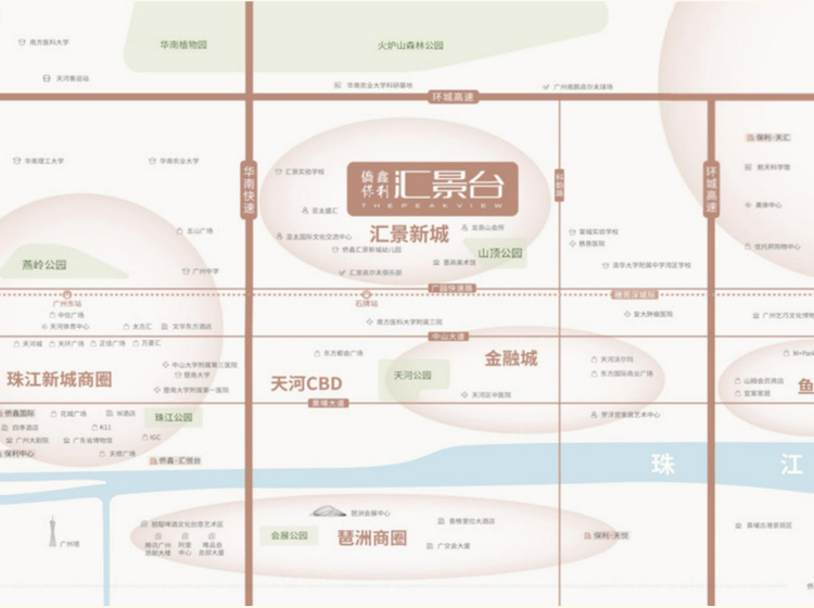 位居天河城央,南近珠江新城,北望火炉山,东望科韵路,西接汇景新城社区两公里景观中轴带,邻近科学城、智慧城、广东奥林匹克体育中心;广园快速、华南快速、深海高速环绕;紧邻地铁3号线五山站,距离珠江新城仅5站。繁华静里,与中央商务区保持恰当好处的距离,出则繁华,入则静谧。