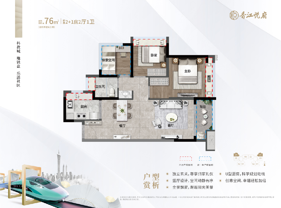 香江悦府项目位于广州科教城,广汕路和朱石路交汇处,距地铁21号线朱村站约1.5公里,交通极为便利。项目总占地面积29190㎡,建筑面积131517㎡。 科教城板块是广州较具发展潜力的板块之一,总投资约1800亿,建设总面积30平方公里,拟引入24所院校,将打造国际一流教育集聚区。产业方面,将会重点推动富士康科技小镇、工信部电子五所、砺剑创新科技园建设,以三大千亿总部带动板块经济发展。此外,以项目为中心,东西南北四个方向的旧改火热启动,四大村(山田村、朱村村、横塱村、南岗村)已确认旧改合作意向,总投资超200亿元,将建设约4032亩宜居宜业新城。 交通方面,地铁21号线朱村站距项目约1.5km,乘快线可实现4站到天河,2站到黄埔。道路方面,项目北面紧邻广汕公路,连通天河、科学城、荔城,连接华南快速。经荔新快速连接新塘,到新塘TOD。距北三环高速朱村东出口仅3公里,快捷通往莞、深等大湾区城市。此外,建设中的增天高速朱村出口据项目约3公里左右,可实现直达天河。 商业方面,项目周边有2大综合体。其中荔富汇景位于山田站地铁上盖,据项目仅2.5km,已开工建设。乘21号线2站地铁(增城广场站)可到增城万达广场。 在医疗配套方面,全亚洲大型三甲级妇幼保健院就建在钟岗站旁边,21号线一站即达,享受优质的医疗服务。该院总投资23.86亿元,总建筑面积约22万㎡,床位1000张,目前已基本竣工。 项目产品共有3种,分别为约76㎡2+1房两厅一卫,88㎡2+1房两厅两卫,101㎡3+1房两厅两卫,两梯五户,均以精装交付。两梯五户降低了每层楼的住户密度,防止拥挤,同时保证了居住的舒适性和私密度。 小区整体规划上,运用合理的建筑单体站位来形成具有围合感的中心花园和开敞明亮的绿色景观通廊,所有户型均自然采光、通风,避免户间视线干扰和栋间的近距离对视。小区以“公园城市”为设计理念,将公园搬到家门口,时刻亲近大自然,享受惬意的健康生活。 小区配套12班幼儿园和约1000㎡体育馆,满足教育和健康需求。规划有2000㎡商业,足不出户尽享繁华。