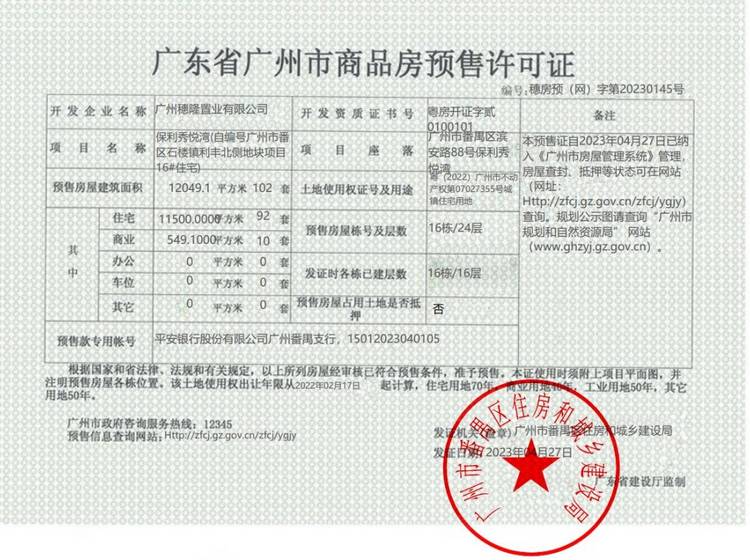 - 穗房预字第20230145号 详情发证时间 2023-04-27绑定楼栋16#证件照片