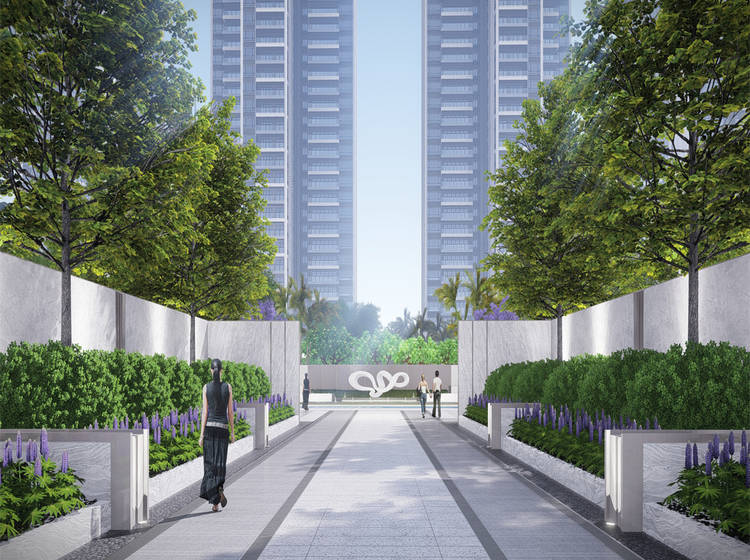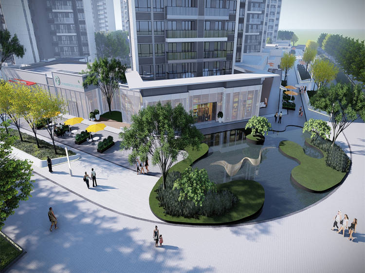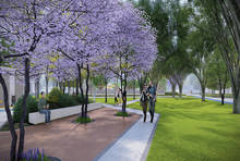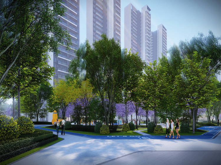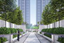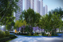 整体采用一核两轴四组团的围合式布局,约1.2万方中央大花园,约230米超长景观轴线