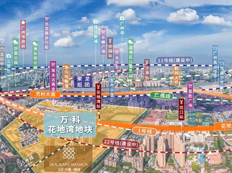 万科·理想花地·瑧园,雄踞广州荔湾核心中轴,耀立于广州白鹅潭核心区-花地湾-聚龙组团CAZ黄金三极之上,位于6线地铁、17条城市/城际轨道(规划中)交汇处,快速链接湾 区交通生活圈。依托万汇天地大城一平方公里湾区金脉聚场资源、双太古(在建中)及华润万象城(规划中)3座醇熟商业配套,际遇繁华鼎盛生活。8所省/市重点中小学环绕,百 年省实(在建中)领衔菁英教育,3公里范围内6所三甲医院,拥享城芯醇熟多元配套生活。万科深耕广州21载,融合主城核心地段及稀缺景观资源,打造广州核心区首个高定瑧 系封面作品。