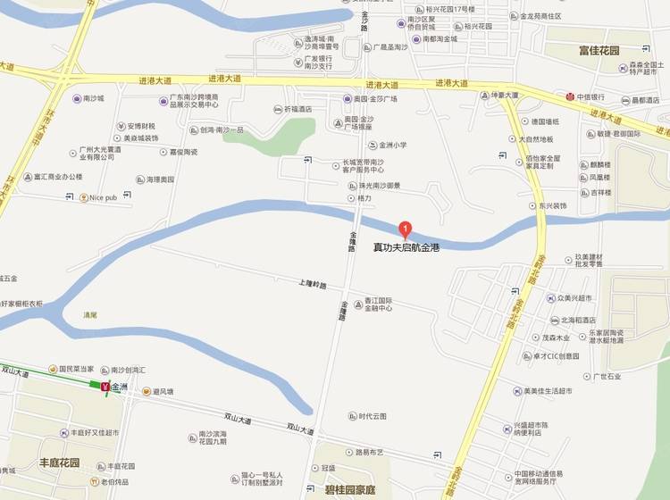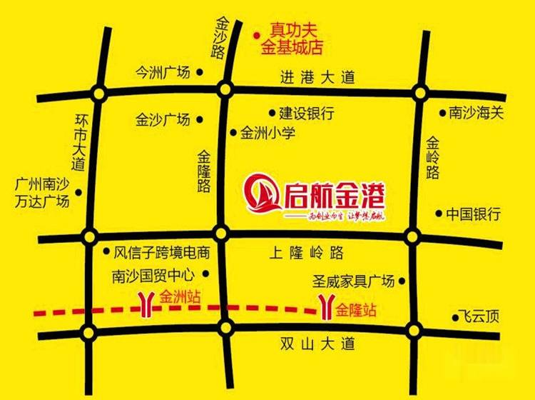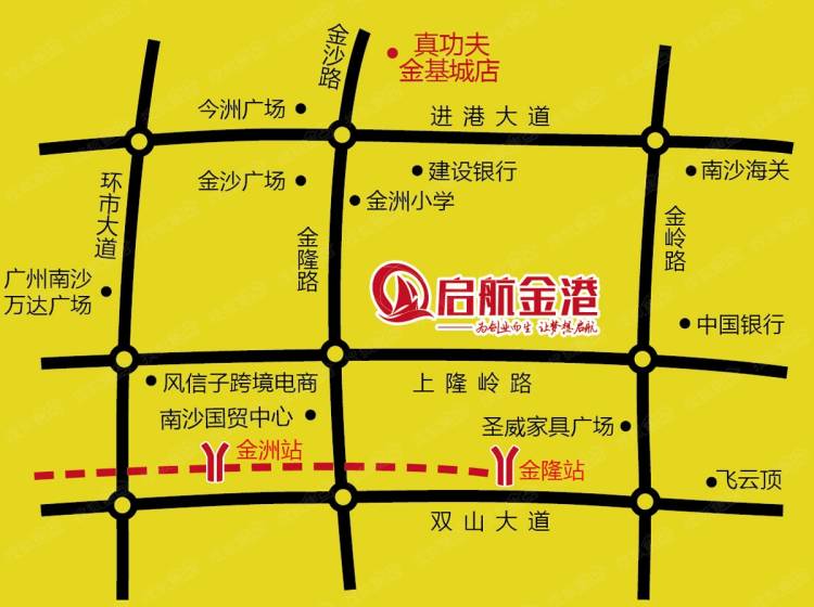 广州路线:南沙港快速路-鱼窝头出口-番禺大道南-南沙牌坊-进港大道-金隆路(430米)-真功夫启航金港;