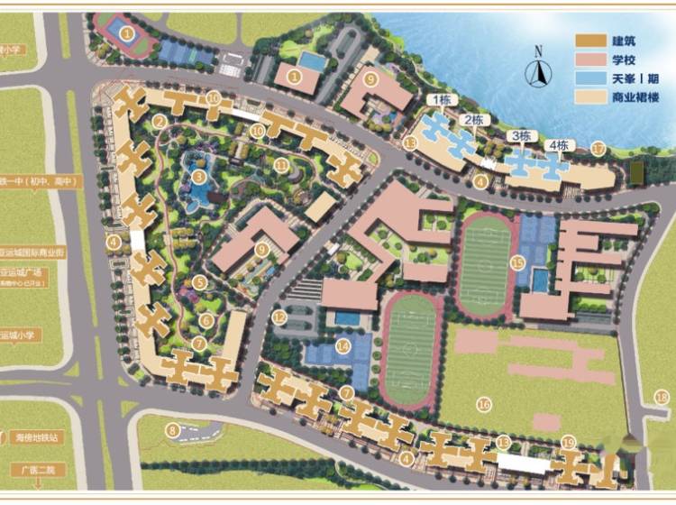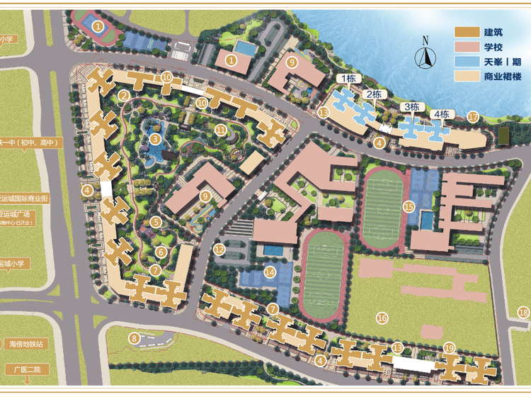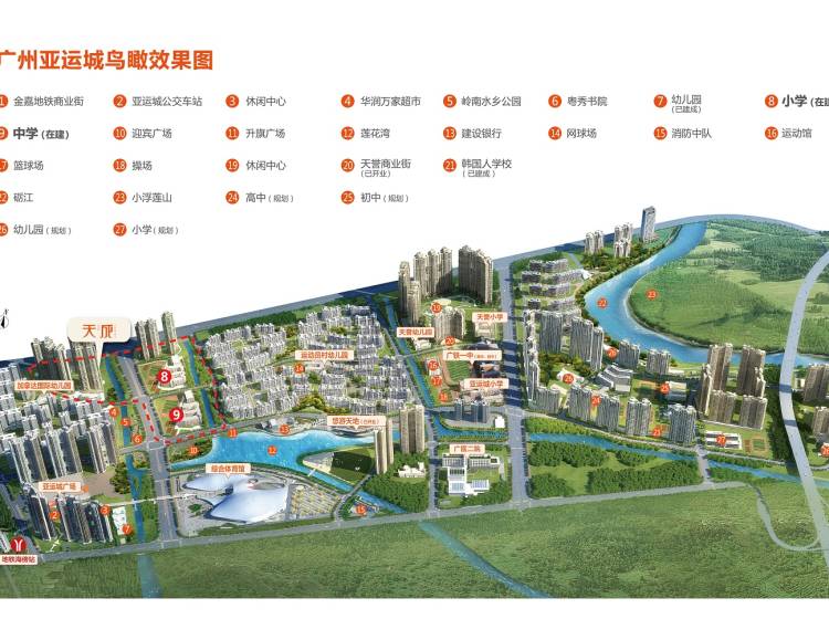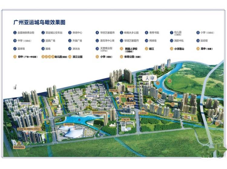 教育:省一级广铁一中亚运城校区(4所)、亚运城小学、天誉小学、运动员村幼儿园、市一级加拿达幼儿园(2所)、韩国人学校,5号幼儿园,目前6所已经开学,已建成13所,在建6所,共18所学校