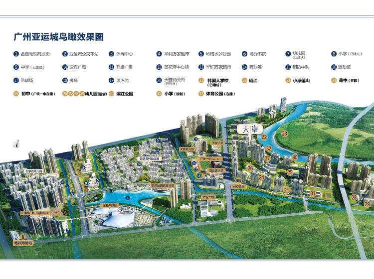 广州亚运城,七年成熟大城,板块即项目,规模大,规划优。 广州亚运城毗邻海傍 站,3站可达大学城,6站至琶洲,7站到金融城。广州亚运城还依托广明高速、南沙港快速、亚运大道等,出行全力提速。 广州亚运城已建成6万方亚运城购物广场,万达影城、人人乐超市等众多 商家现已进驻,水岸风情商业街、金嘉商业街、尚上商业街更是能为你提供丰富的休闲生活。4家华润万家超市已分别在国际区商业 、媒体村、运动员村开业,名品荟萃,齐全的生活配套 解决业主的“吃喝玩乐。” 亚运城天成全新组团,设计更时尚、建筑科技更科学;天成组团由11栋住宅组成,采取半围合式布局,十字型楼栋设计,确保充分采光通风。小区毗邻岭南水乡公园,北眺莲花山色,东南望亚运城 湖景,南瞰百万方宏伟大城,开阔楼距视野开扬。匠心设置七彩儿童乐园、绿荫慢跑绿道、 亲水广场、森林氧吧泳池等8大全龄功能区,是儿童的游乐园,是长者的静养花园,更是邻里的花园会客厅。