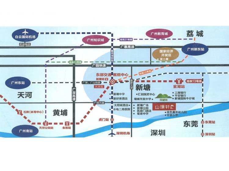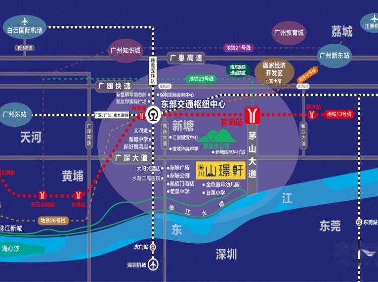 海川山璟轩位于新塘城镇中心,紧靠大润发商圈,广州东部交通枢纽辐中心,距离地铁13号线官湖站约1.5公里、地铁23号线坭紫站0.5公里。