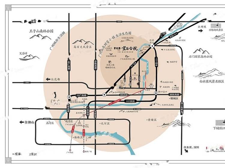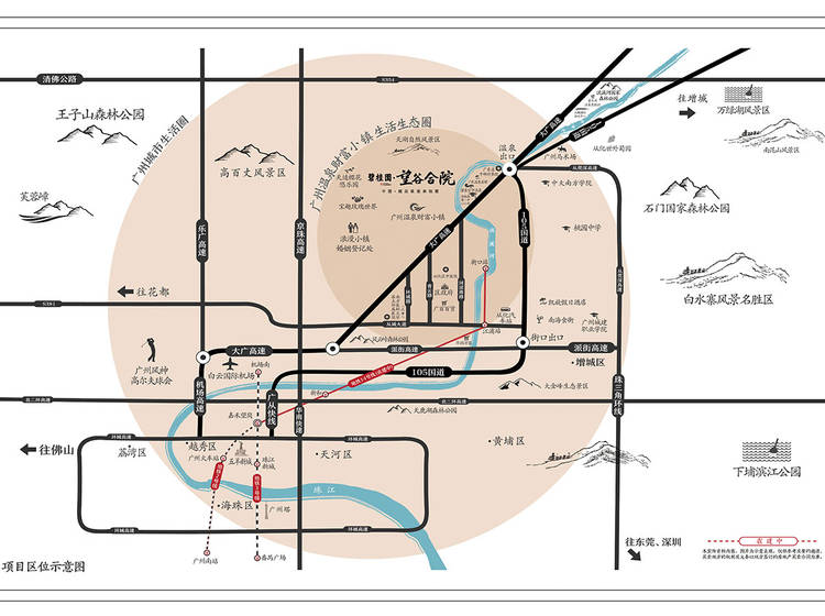 珠江新城:走华南快线转入京港澳高速,行驶21.0公里,进入大广高速,行驶34.5公里,从大广高速到温泉大道,行驶610米,进入温泉大道,行驶2.6公里,进入G105,行驶390米,进入冲口路,行驶1.1公里,进入Y522,行驶110米到达碧桂园望谷合院