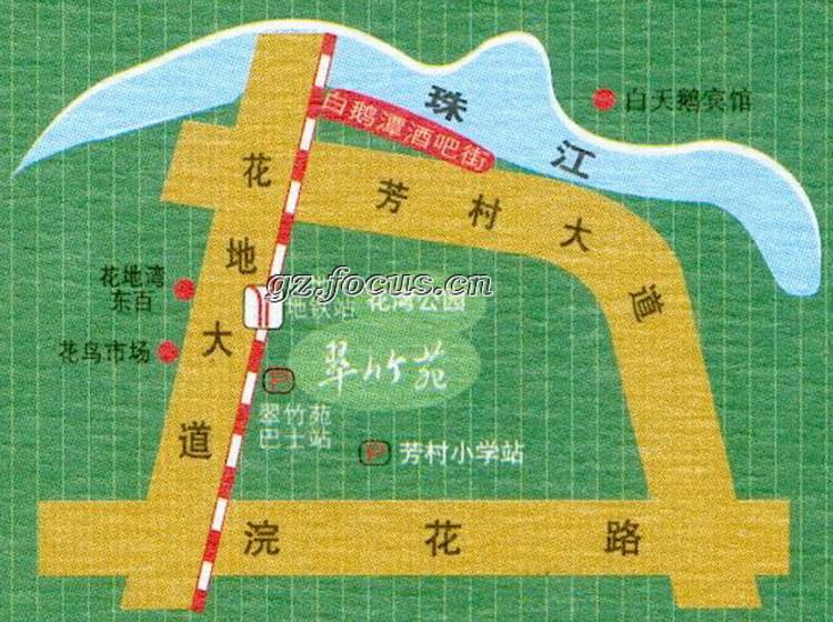 天河方向:珠江新城走花城大道往西,左转进入广州大道,过海珠区府后右转进入新滘西路,直走进入工业大道南,往北走然后左转进入鹤洞大桥,进入芳村大道东,行驶1.1公里,右转,进入浣花路,行驶1.1公里,右转,进入彩凤路,行驶140米,右转,从彩凤路到翠竹苑,行驶100米到达翠竹苑。