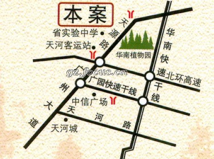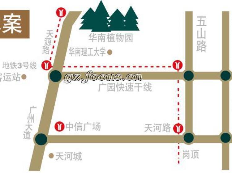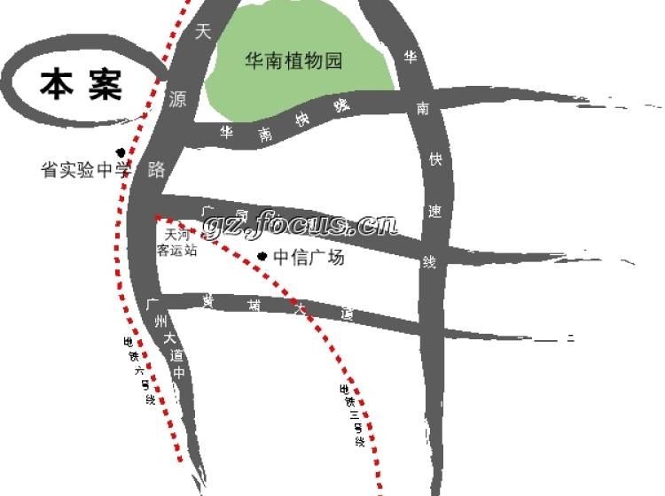 项目位于天河之北植物园板块的中心,拥有完善的交通路网。地铁三号线设有“天河客运站”,2006年已经顺利开通;6号线也即将开工,将设有“华南植物园站”。此外该地段还拥有8条公交线,以及天河客运站,尽享都市繁华、便捷与宁静。加上广汕路、内环路、华南快速干线、京珠高速公路,便捷的交通让都市人15分钟进入都市生态圈,较大限度地让都市人以最短的距离感受城市的繁华与山海的幽美。