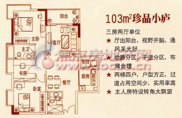 3室2厅2卫-珠江南景园美庐组团103平方米珍品小庐单元平面