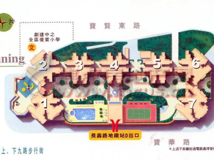 健身中心、网球场、花园、小学、公所、泳池、停车场。小区内部配套:大型住客会所,网球场、游泳池,空中花园等 。其他:电梯内设闭路电视连接管理处,各户装置可视式防盗对讲机系统;专业管理公司提供二十四小时大厦保安及管理服务;裙楼四、五层为现代化停车场;六层各座入口大堂侧设信箱柜,每个住宅单元均有独立信箱。