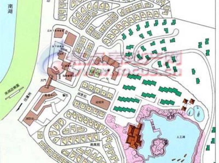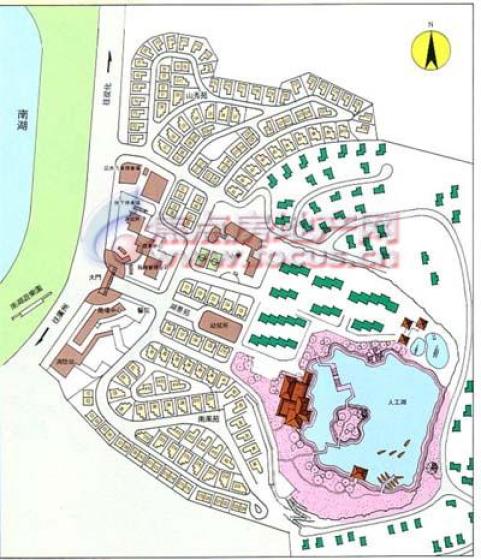 南湖山庄沿山势而建,有层次感。建筑立面采用浅绿与米黄的对比,每栋别墅都有自我的独立天地。
