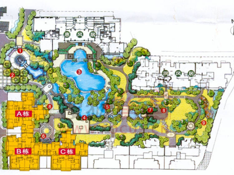 星怡居与星悦居分以半围合式南北排列,中心花园在小区东西两端开口,开口东宽西窄,既可保证大部分单元东望白云山的景观,也可合理引入白云山的自然风使之在区内穿行。