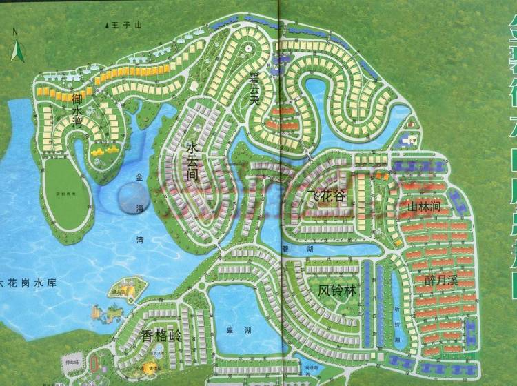 香格岭、风铃林、飞花谷、水云间、碧云天、御水湾六大组团别墅,全部环山分布,幢幢居山临水,景观开扬,一览天地。金碧御水山庄配套齐全,山顶豪华会所、中西餐厅、商业街、超市、屋村巴士、生活所需,应有尽有;超大型运动中心、,足球场、网球场子、游泳池、运动天地,激情飞扬,逍遥自在;幼儿园、小学、青少年教育基地、游乐场,儿童教育成长的欢乐谷;高业中心、多功能综合楼,配套优质考究,全面提升生活素质;星级管家服务,智能化物业管理,全天候皇室安保。