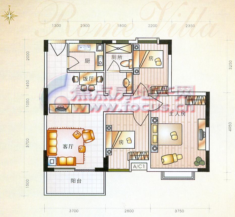 2室2厅1卫-罗马家园凯雅庭A1-A5栋标准层#04户型