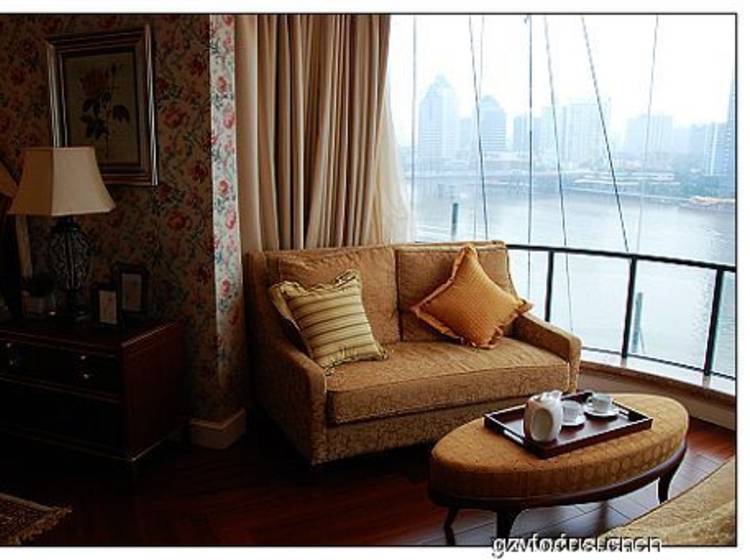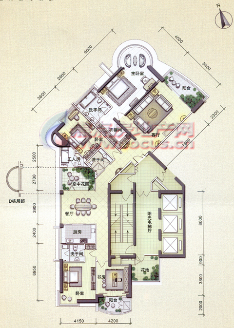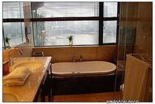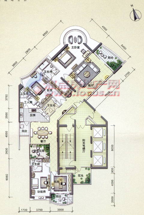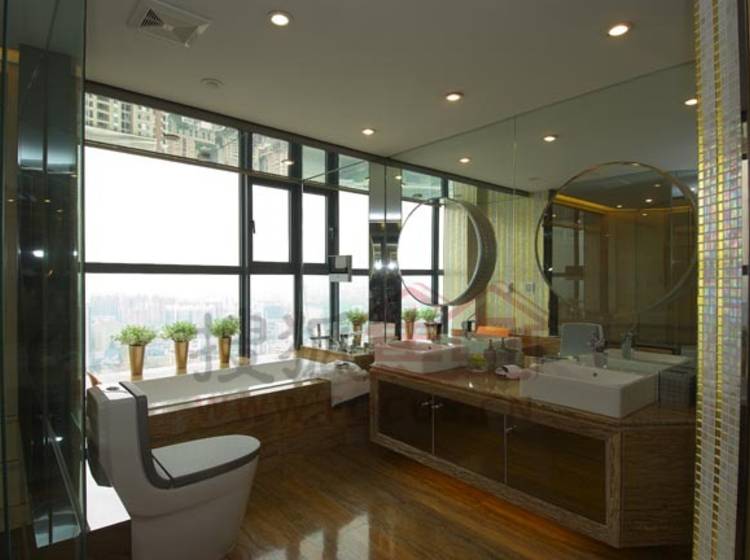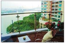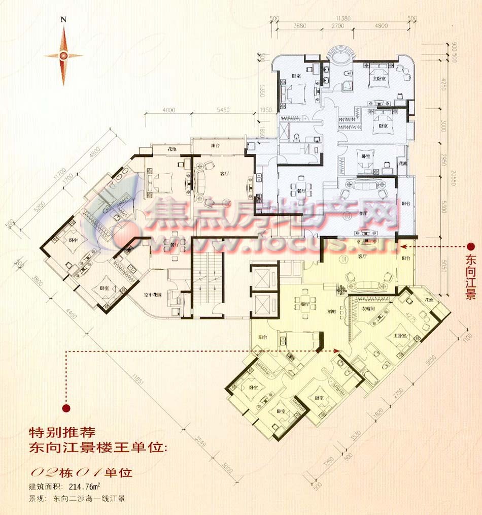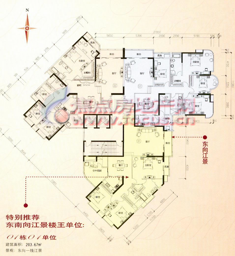该楼盘所有单位为跃式设计,北向两个单位望江景观较好,厅和四个房间都望江。南侧两个单元也可以正望江,而且户型设计独特。单元带两个外阳台,北向阳台望江,南向10多平方米的大阳台就采用上下两层交错设计,使阳台的高度达到6米,形成空中花园。另外,单元还特意为主人房卫生间设计圆弧形落地窗,安装圆形按摩浴缸,成为观景浴缸。