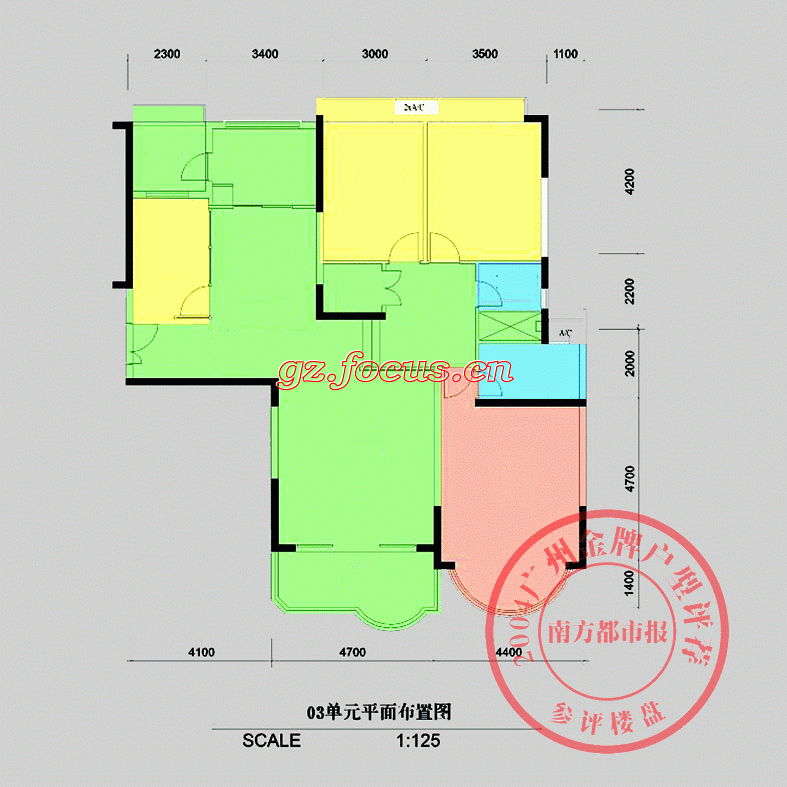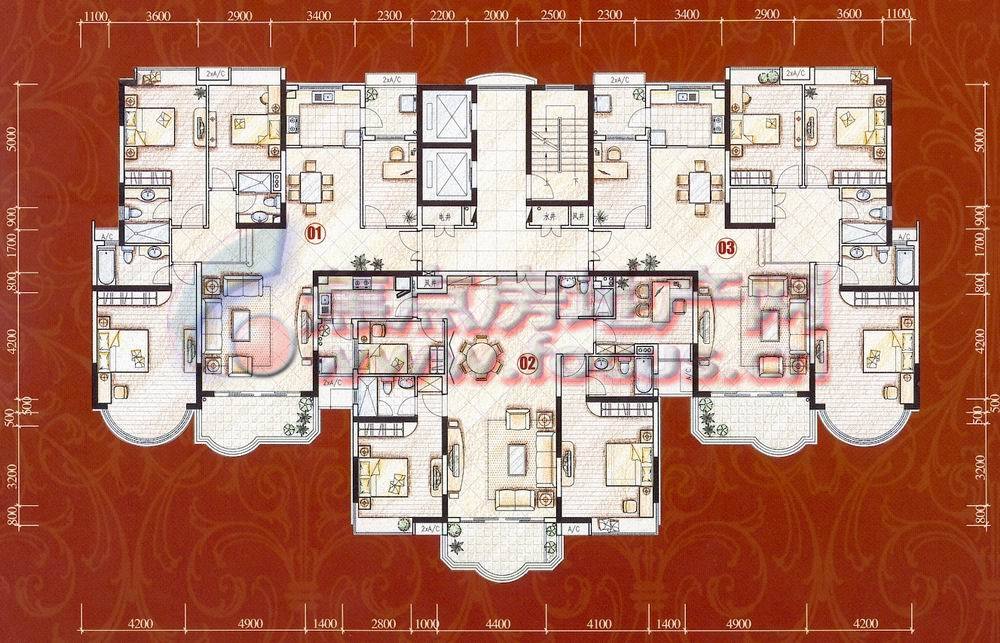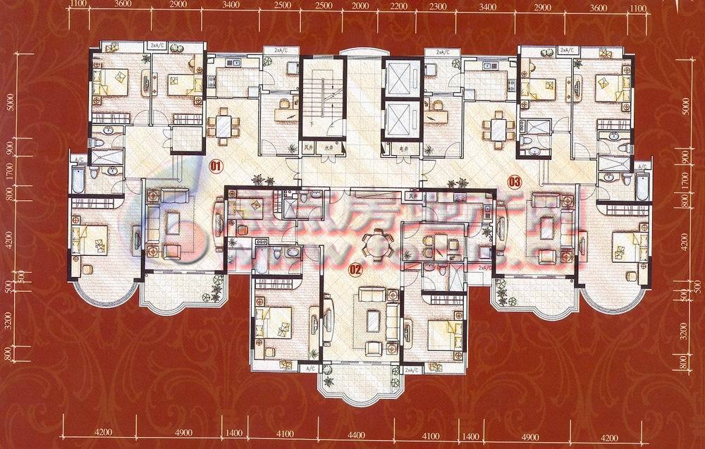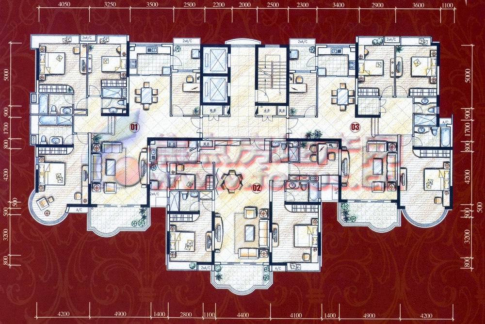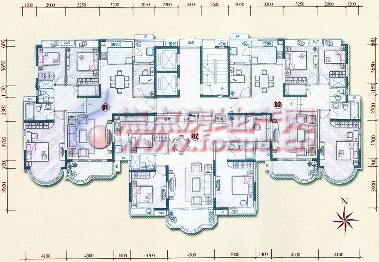所有楼宇都是1梯3户呈品字形设计,01单元是一个完全南北对流的单位,通风、采光非常好。该户型还采用了跃式设计,把客厅和饭厅自然分隔开,三个卧室也归一,功能区间分隔良好。由于该盘楼宇为南北两列排列,中间为大型园林。而两排楼宇中都有该种户型,所以买家有两种选择,一是南排楼宇的01单元,南北望两个园林,更能正望南面的大型绿化。二是北排楼宇的01单元,客厅和主人房正望整个中心园林。户型突破:在入门处,该单元还设计了书房或客房的功能,增加了其他房间的私密性。