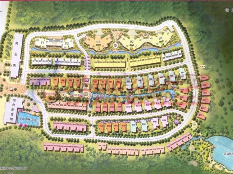 遵循原有的自然地貌,依山势形成坡地建筑群,实现了平面空间创新和台地式建筑的组团设计,在园林设计上,较大的特点就是将引入山上的天然泉水,形成园林的水景。主要景观由原生森林、半山天湖公园、生态天然泉溪、中央水景步行区等组成。
