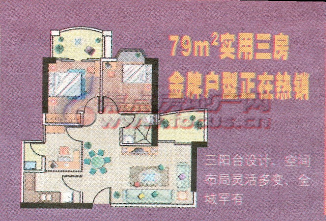 楼盘一梯八户设计,主力户型是65-79平方米的紧凑型二房及84-102平方米的实用型三房单位,所有单位都难得地拥有双阳台设计、而南座南向的08单位还作出三阳台设计,阳台宽度也达到1.8米。另外,楼盘大部门单位都啬增加房间的舒适度,卧室面积都比较大。