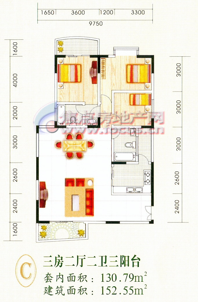 3室2厅2卫-翡翠名都三房二厅二卫C型单元平面