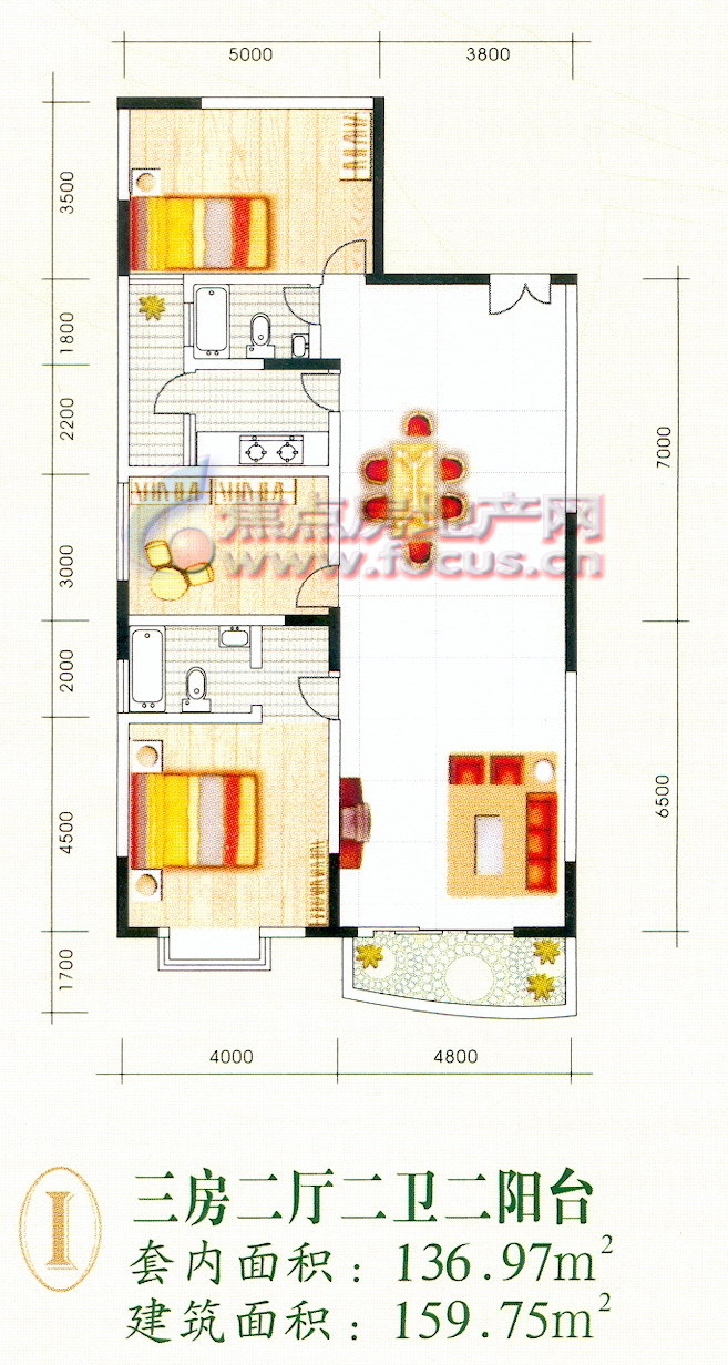 3室2厅2卫-翡翠名都三房二厅二卫I型单元平面