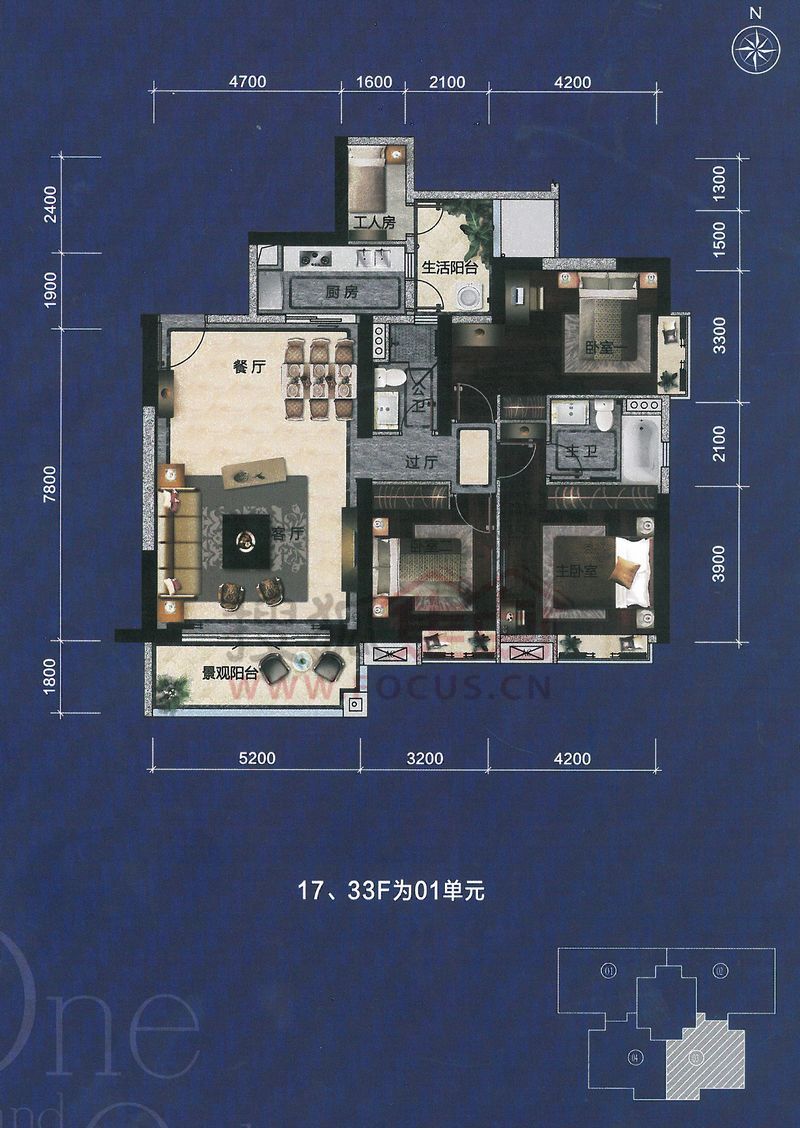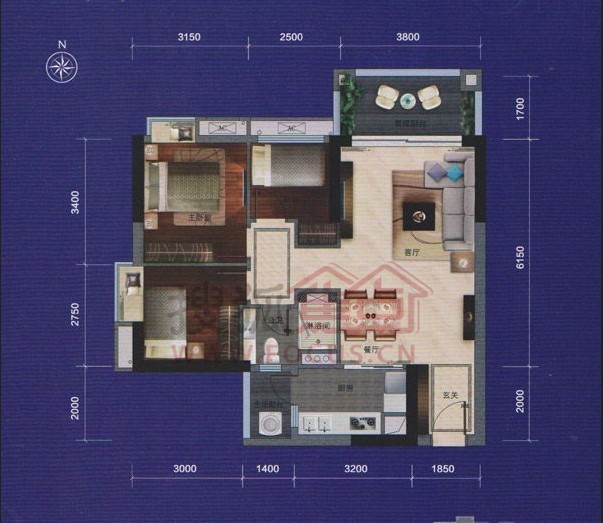 3室2厅1卫-A栋01户型3房2厅1卫91㎡
