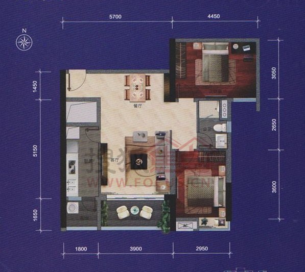 2室2厅1卫-A栋05户型2房2厅1卫89㎡