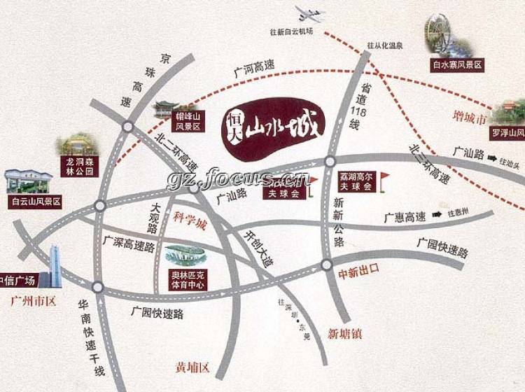 增城恒大山水城位于东广州,地块四面环山,山林隽秀,自然环境优势突出。项目具有丰富的生态资源、交通规划合理,规划定位为集酒店、休闲、健身为一体的超大型原生态山林 · 湖泊 · 别墅社区,配建了五星级豪华酒店、运动中心、饮食中心等设施,并在各方面与全球知名的合作伙伴达成战略联盟,温德姆国际酒店管理集团、戴德梁行国际物业管理集团、育才幼儿园等等。