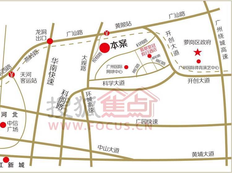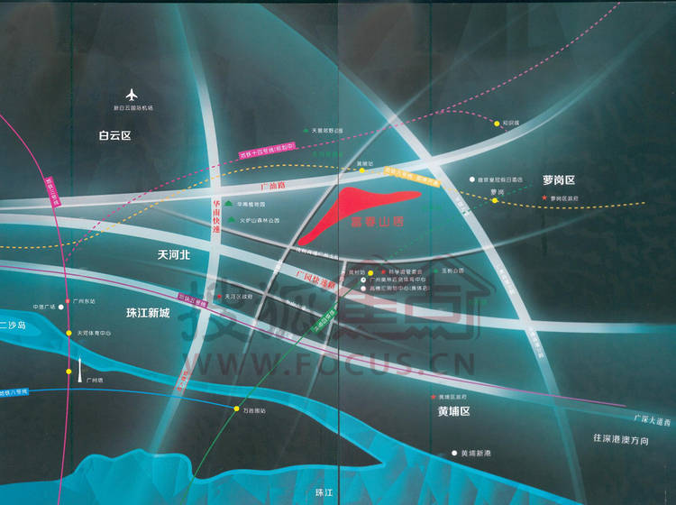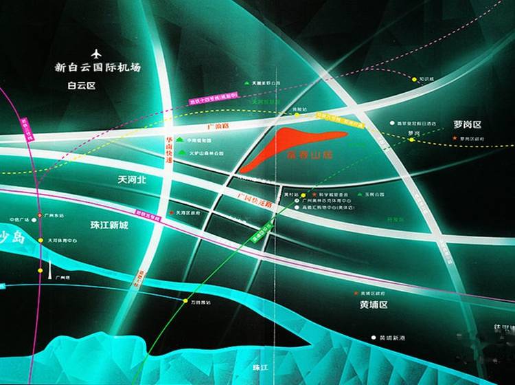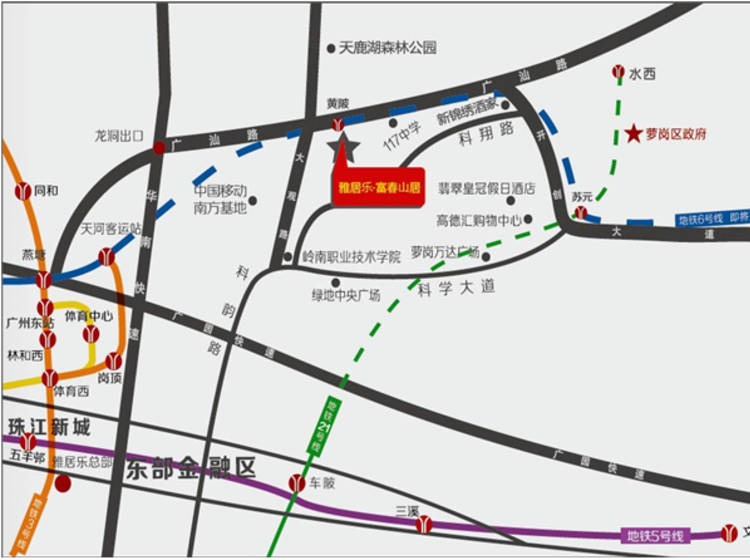 从珠江新城出发——经过黄埔大道、华南快线进入科韵北路——前行350米靠左右转至华观路——继续前行440米到达大观中路——雅居乐富春山居