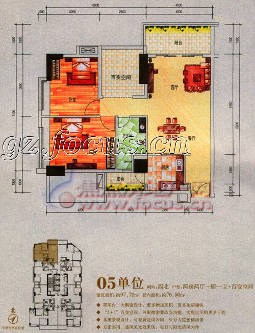 2室2厅2卫-洪都逸品97.70㎡两房两厅05单位