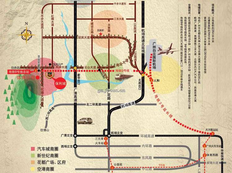 项目地块距离花都区政府和广州的车程分别为15分钟和30分钟,地铁3号线、9号线、14号线,2013年年底开通的地铁9号线的终点站(汽车城站)就确立在保利城小区门口。