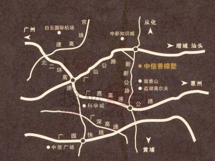 朝韶关/广清高速/广河高速/华南快速(西)方向——朝长深高速/九龙/河源/梅州方向——朝新塘方向,右转进入新新大道北——朝中新镇政府/中信香樟墅方向,左转进入新墩路
