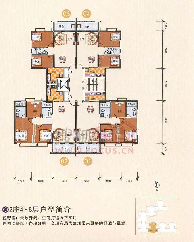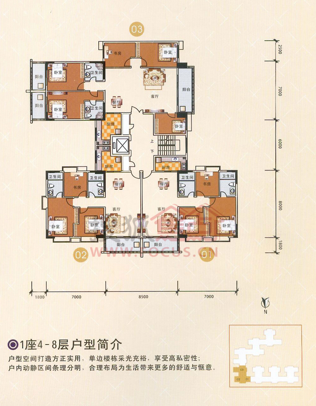 项目规划为7栋9层群楼,首层停车场,夹层未来规划未定,2-9层为住宅,9层为复式大户型。每栋独立电梯,一梯4户。户型有2房,3房,4房,5房。单间户型从75-188平方米。复式较大315平方米。其中,2层亮点为空中花园景观,专业园林设计。穿透式设计直接连通2层夹层。2层超高3.8米楼高;3层住宅附送小阳台百变空间;顶层复式可打造家庭式顶层庭院。