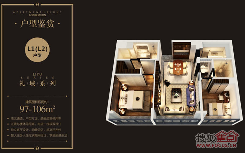 项目呈半围合式建筑布局,整个小区考虑商业动线与住户动线的严格区分,通过设置地下车行道与地上商业人行道,既保证住户空间私密性,又营造浓厚的商业气氛。同时项目在东侧临石岗路打造开放式商业连廊,充分利用临街商业价值及围绕江景全力塑造滨江商业艺术街区。